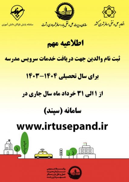 علیرضا زارع ادامه داد: آیین نامه حمل و نقل دانش آموزی و آدرس سامانه ثبت نام سپند، به همه سازمان های مدیریت حمل و نقل شهرداری های کشور از جمله رشت از سوی اتحادیه تاکسیرانی کشور، ابلاغ شده است.