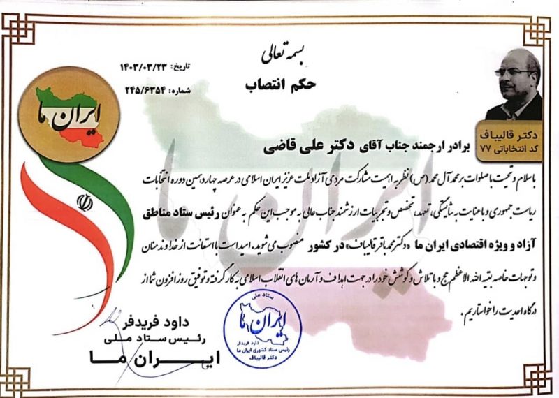به گزارش پایگاه خبری تحلیلی ایده آل خبر طی حکمی از سوی داود فرید فر رئیس ستاد انتخاباتی (ملی ایران ما ) دکتر محمد باقر قالیباف ، دکتر علی قاضی بعنوان رئیس ستاد مناطق آزاد ویژه اقتصادی ایران ما ( دکتر محمد باقر قالیباف در کشور) منصوب شد