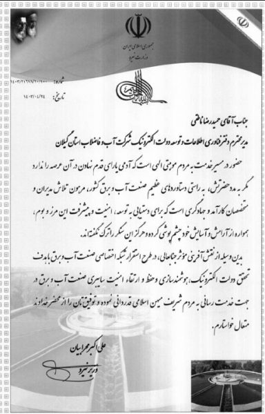بدین وسیله از نقش آفرینی موثر جنابعالی، در طرح استقرار شبکه اختصاصی صنعت آب و برق با هدف تحقق دولت الکترونیک، هوشمندسازی و حفظ و ارتقاء امنیت سایبری صنعت آب و برق در جهت خدمت رسانی به مردم شریف میهن اسلامی قدردانی نموده و توفیق تان را از محضر خداوند متعال خواستارم.