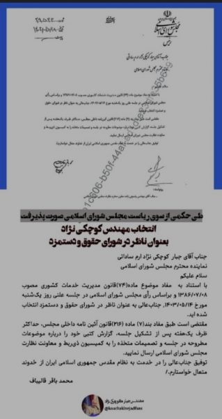 با استناد به مفاد موضوع ماده(۷۴) قانون مدیریت خدمات کشوری مصوب ۱۳۸۶/۰۷/۰۸ و براساس رأی مجلس شورای اسلامی در جلسه علنی روز یکشنبه مورخ ۱۴۰۳/۰۵/۱۴, جنابعالی به عنوان “ناظر در شورای حقوق و دستمزد” انتخاب شده اید.