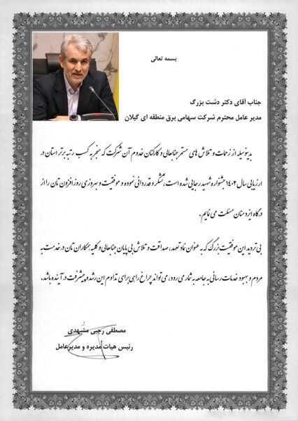 در بخشی از این لوح سپاس آمده است: « بیتردید این موفقیت بزرگ که به عنوان نماد تعهد، صداقت و تلاش بی پایان جنابعالی و کلیه همکارانتان در خدمت به مردم و بهبود خدماترسانی به جامعه به شمار میرود، میتواند چراغ راهی برای تداوم این رشد و پیشرفت در آینده باشد.»