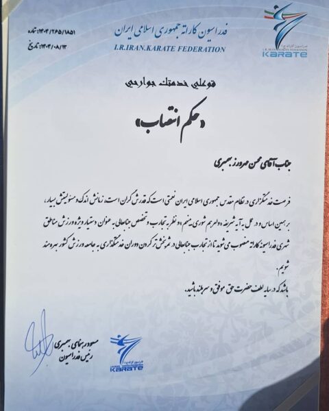 «فرصت خدمتگزاری در نظام مقدس جمهوری اسلامی ایران نعمتی است که قدرش گران، زمانش اندک و مسئولیتش بسیار است. بر همین اساس و در عمل به آیه شریفه «وَأَمرُهُم شُورى بَينَهُم» و با توجه به تجارب و تخصص جنابعالی، بهعنوان دستیار ویژه ورزش مناطق شهری فدراسیون کاراته منصوب میشوید تا از توانمندیها و تجارب شما در ثمربخش کردن دوران خدمتگزاری به جامعه ورزش کشور بهرهمند شویم. باشد که در سایه لطف حق موفق و سربلند باشید.»